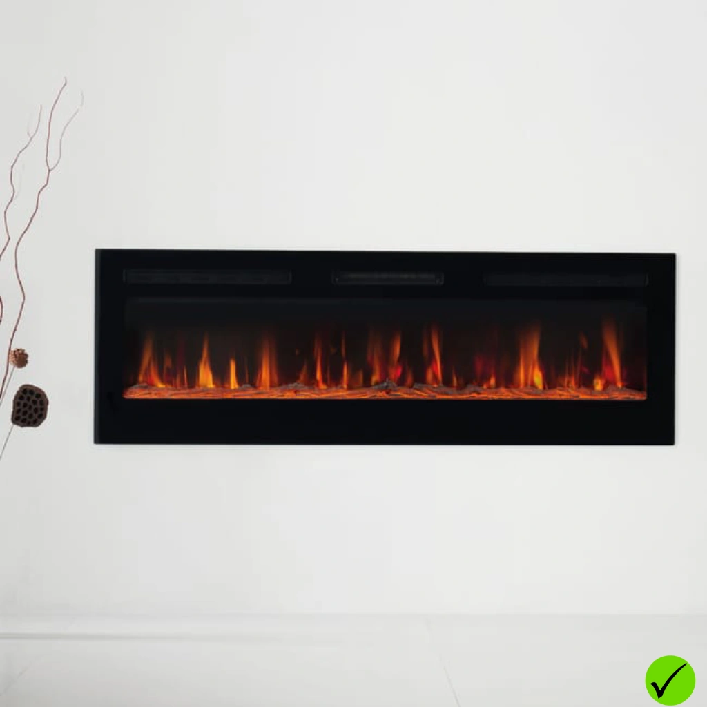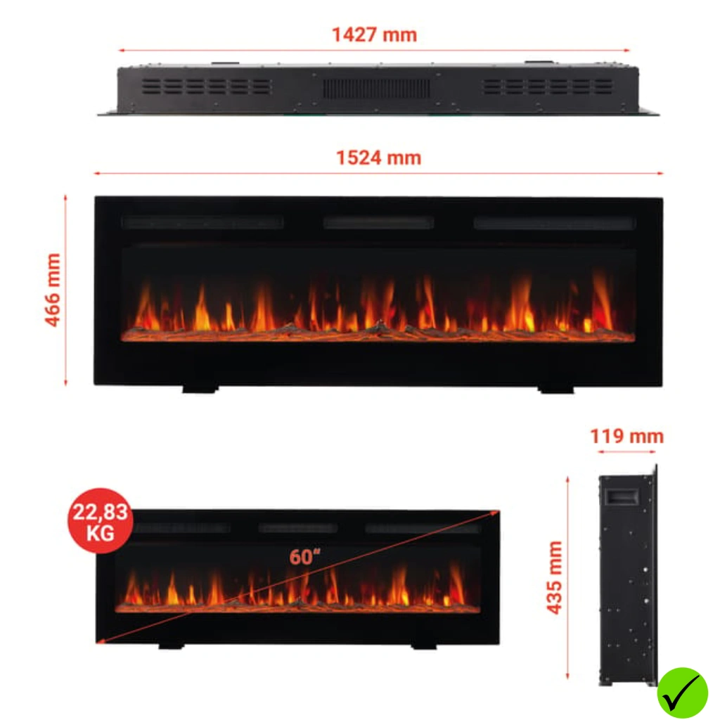 La chimenea aporta una ambientación inmediata: la llama es creíble y el tamaño 60″ llena visualmente la habitación. Se maneja con facilidad mediante el mando; el temporizador y los modos facilitan el uso diario.